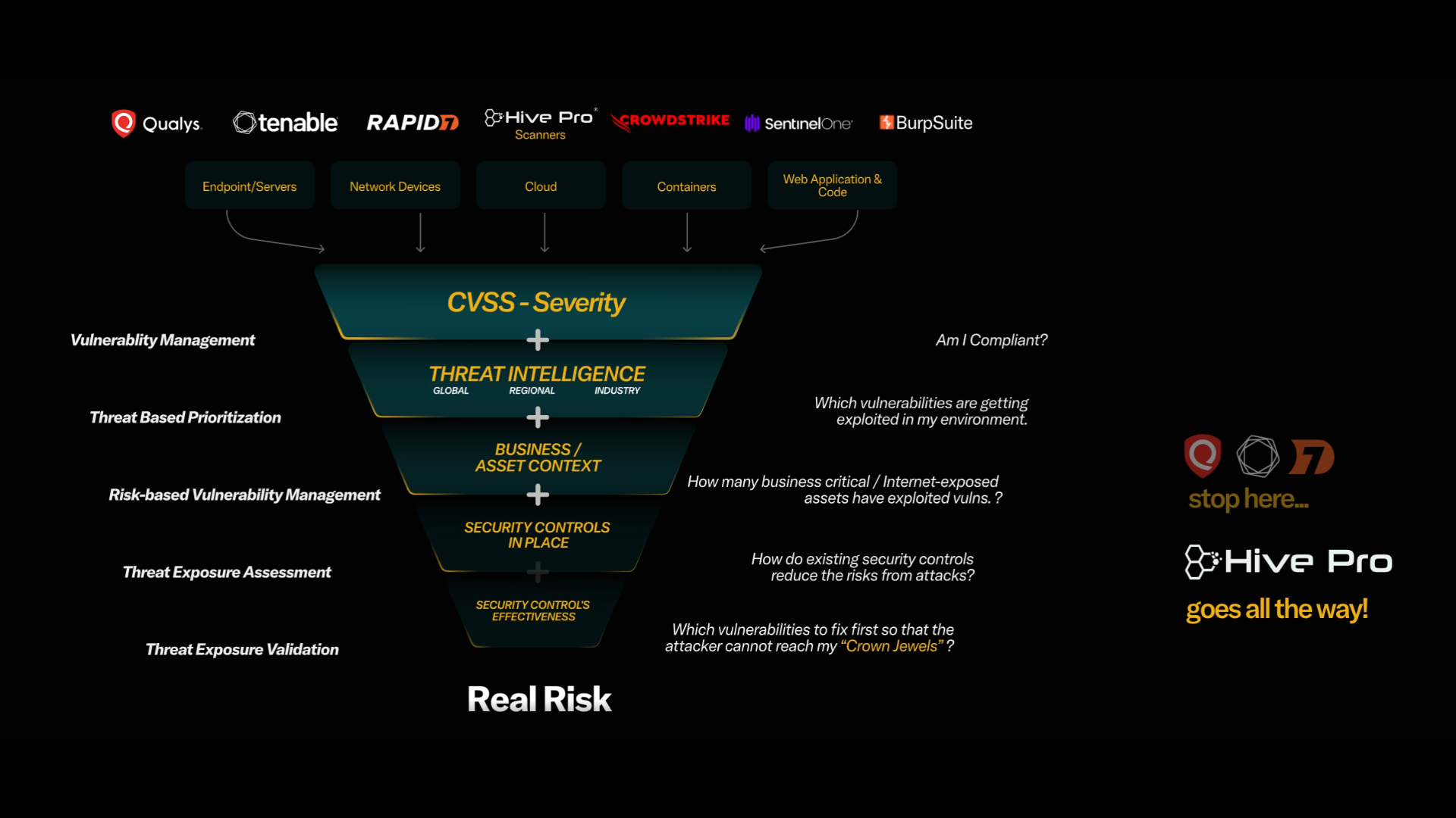 Discover assets, vulnerabilities, misconfigurations from code to cloud without logging onto multiple individual platforms. With Hive Pro platform, scans can be orchestrated across Qualys, Tenable, Rapid7, BurpSuite, etc and the results are ingested, de-duplicated, normalised and correlated automatically.